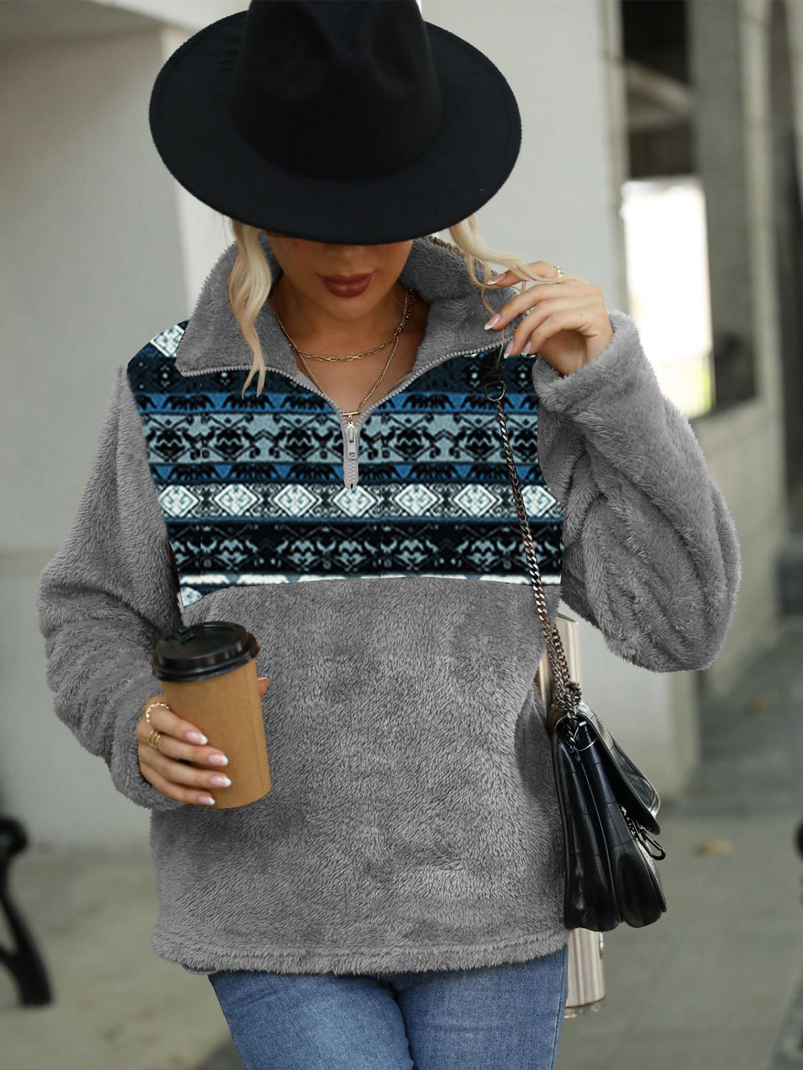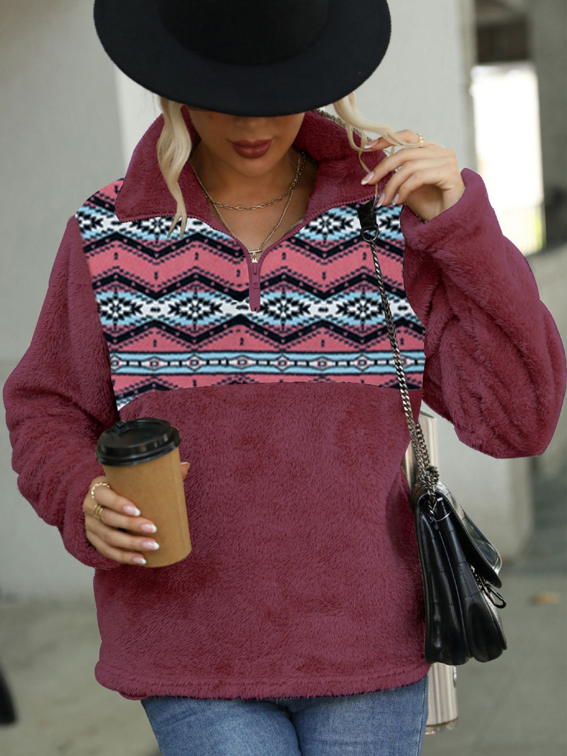 Geometric Quarter-Zip Collared Sweatshirt