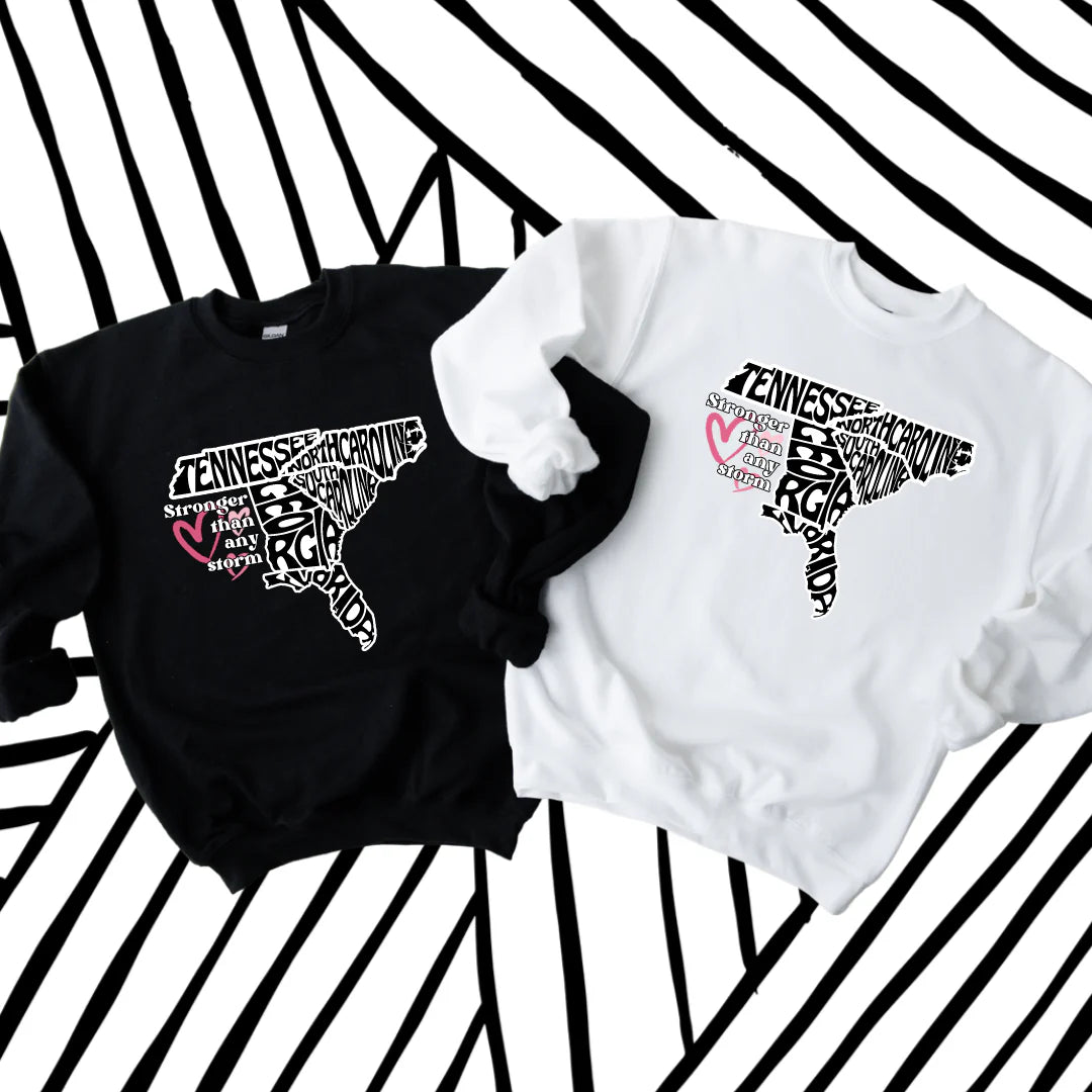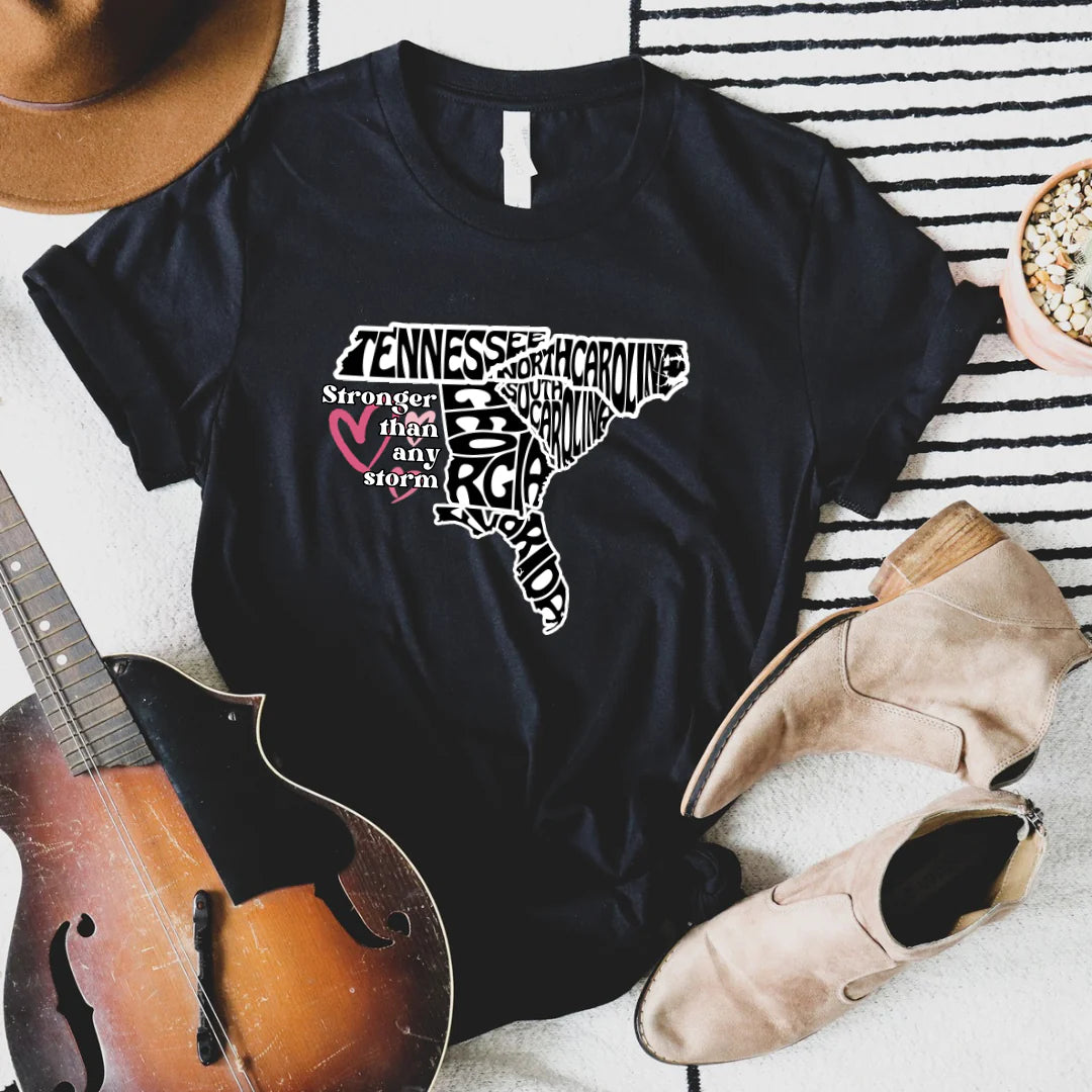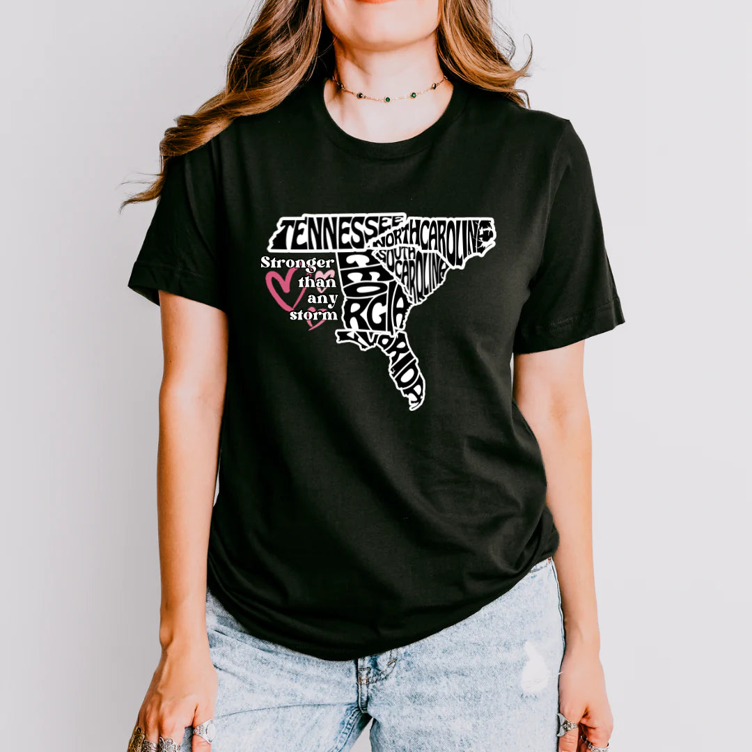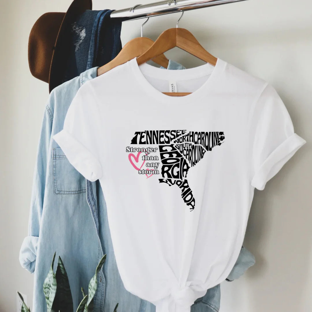 FUNDRAISER: stronger than any storm. We combined all the states that were hit hard from Hurricane Helene. Profits from this shirt will go to purchase items that have been requested of what they are in dire need of and that will be brought in by helicopter as that is the only why currently to get in and out of many of the towns in the mountains.